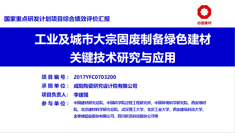 2022年1月13日,由咸陽陶瓷研究設計院有限公司牽頭承擔的“工業及城市大宗固廢制備綠色建材關鍵技術研究與應用”項目在北京順利通過驗收與績效評價。
